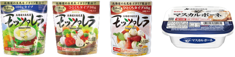 主に日高管内で生産される生乳を原料に、“ミルク感”を生かした各種フレッシュチーズを製造している。道内の大手スーパーをはじめ、全国に展開する主力の「モッツァレラ」は、用途で選べる3タイプ。青のラベルが目印の「100gタイプ」はスライスしてカプレーゼなどの料理に、赤いラベルの「ひとくちチェリータイプ」は96gタイプと使い切りの48gタイプ。カットの手間なくサラダ、ピザ、パスタなどのトッピングに使いやすい。フレッシュさを保持するのが、独自の製法技術。スタンディングパウチ包装でやわらかさとクリーミー感を楽しめる。また、生クリームのようなコクがあり、なめらかな口当たりが特長の「マスカルポーネ」は、定番のティラミスをはじめ、さまざまな料理によく合う。