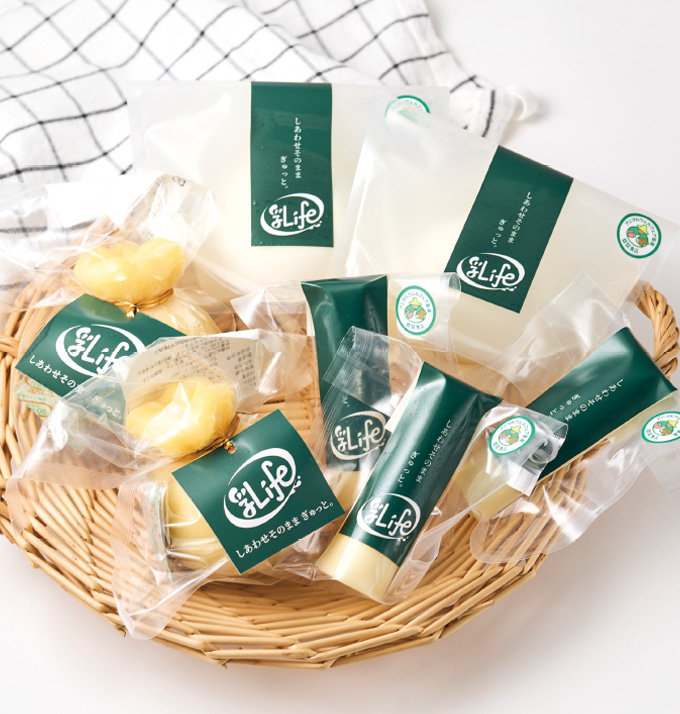 夫妻で各地のチーズ工房などを巡って研究を重ね、2016年に自宅横に工房を建設。工房名の「乳life(にゅうらいふ)」には、ミルクのある暮らしをもっと豊かにしたいという思いがこめられている。「放牧しているので、季節によって生乳の味が全然違うんです。チーズの味の変化も楽しんでいただきたいですね」。塩分控えめで牛乳の味が感じられる「さけっちょ」をはじめ、地元の道の駅などで販売されている坂根牧場のチーズで、四季の味わいを楽しみたい。