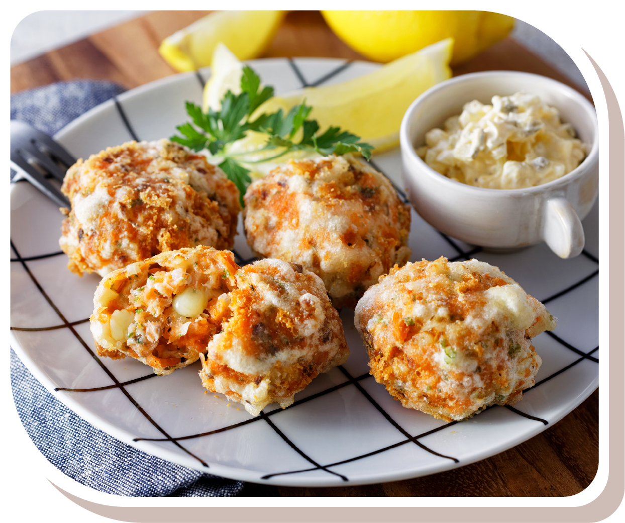 - レモン、ヨーグルトタルタルソース(*)を添える。
